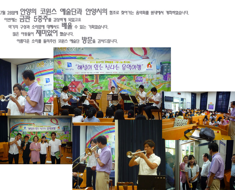 7월 찾아가는 음악회 개최 페이지 정보 작성자 운영자 댓글 0건 조회 7,394회 작성일 10-09-03 04:36 본문 코윈스예술단과 안양시의 협찬으로 안양의집에서 찾아가는 음악회를 개최하며 금관 5중주의 멋진 소리를 듣게 되었습니다. 감사합니다. 목록 이전글2010년 자립지원 전담요원 채용면접심사 결과공고 10.09.03 다음글안양의집 캠프 준비 10.09.03