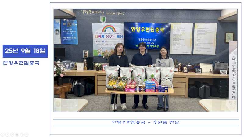 25년 9월 18일 안양우편집중국 후원품 전달 페이지 정보 작성자 운영자 댓글 0건 조회 125회 작성일 26-01-31 11:10 본문 안양우편집중국에서 쌀, 사과, 감귤, 과자 등 후원품을 전달해 주셨습니다. 목록 이전글25년 9월 축구레슨 26.01.31 다음글25년 9월 17일 안양건강보험관리공단 후원금 전달 26.01.31 댓글목록 댓글목록 등록된 댓글이 없습니다.