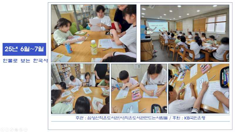 삼성산작은도서관 (사)작은도서관만드는사람들에서 후원하여 6~7월 6회기에 걸쳐 인물로 보는 한국사 수업을 진행하였습니다.