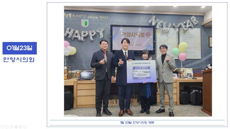 2025년 1월 23일 안양시의회 후원방문 페이지 정보 작성자 운영자 댓글 0건 조회 1,001회 작성일 25-01-29 13:50 본문 안양시의회에서 후원방문 해주셨습니다. 목록 이전글2025년 1월 20일 안양과천교육지원청 후원방문, 1월 일정 공지 25.01.29 다음글2025년 1월 22일 지디씨주식회사 후원방문 25.01.29 댓글목록 댓글목록 등록된 댓글이 없습니다.