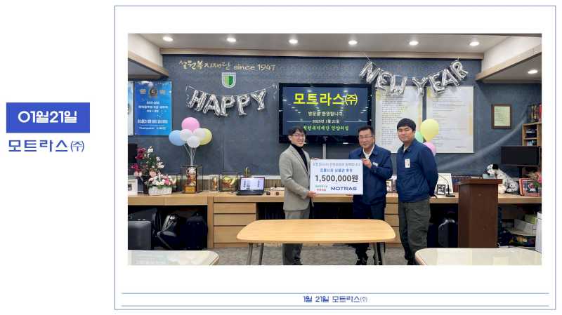 2025년 1월 21일 모트라스(주)에서 후원방문 페이지 정보 작성자 운영자 댓글 0건 조회 863회 작성일 25-01-29 13:48 본문 모트라스(주)에서 후원방문 해주셨습니다. 목록 이전글2025년 1월 21일 법무부 후원방문 25.01.29 다음글2025년 1월 21일 국립현대미술관 후원방문 25.01.29 댓글목록 댓글목록 등록된 댓글이 없습니다.