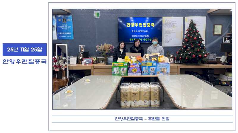 안양우편집중국에서 아이들을 위해 화장지, 과자, 세제 등 후원품을 전달해 주셨습니다.