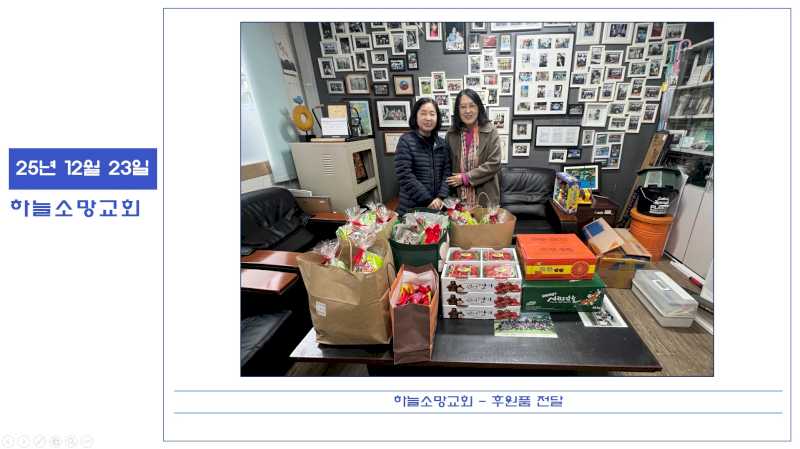 하늘소망교회에서 방문하셔서 아이들을 위해 과일, 과자 등 후원품을 전달해주셨습니다.