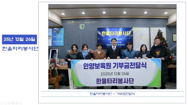 25년 12월 26일 한울타리봉사단 기부금전달식 페이지 정보 작성자 운영자 댓글 0건 조회 205회 작성일 26-02-10 13:29 본문 한울타리봉사단에서 방문하셔서 기부금을 전달해 주셨습니다. 감사합니다. 목록 이전글25년 12월 안양의집 송년식, 12월 일정공지 26.02.10 다음글25년 12월 24일 안양의집 성탄제 26.02.10 댓글목록 댓글목록 등록된 댓글이 없습니다.